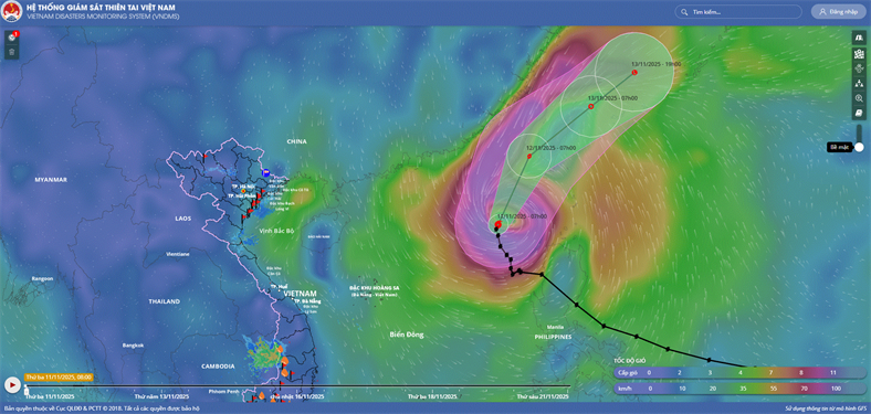 Hồi 19 giờ ngày 10/11, vị trí tâm bão ở vào khoảng 18,1 độ Vĩ Bắc; 118,6 độ Kinh Đông, trên vùng biển phía Đông khu vực Bắc Biển Đông. Sức gió mạnh nhất vùng gần tâm bão mạnh cấp 13 (134-149km/giờ), giật cấp 16. Di chuyển theo hướng Bắc Tây Bắc, tốc độ khoảng 10km/h.