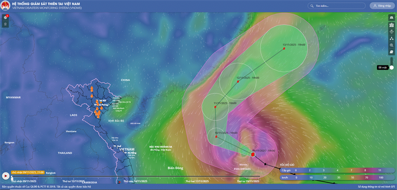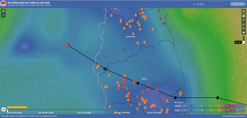 Hồi 19 giờ ngày 05/11, vị trí tâm bão ở vào khoảng 12,3 độ Vĩ Bắc; 116,3 độ Kinh Đông, cách đảo Song Tử Tây khoảng 240km về phía Đông Đông Bắc, cách Quy Nhơn (Gia Lai) khoảng 800km về phía Đông Đông Nam. Sức gió mạnh nhất vùng gần tâm bão mạnh cấp 14 (150-166 km/giờ), giật cấp 17. Di chuyển theo hướng Tây Tây Bắc, tốc độ khoảng 25km/h.
