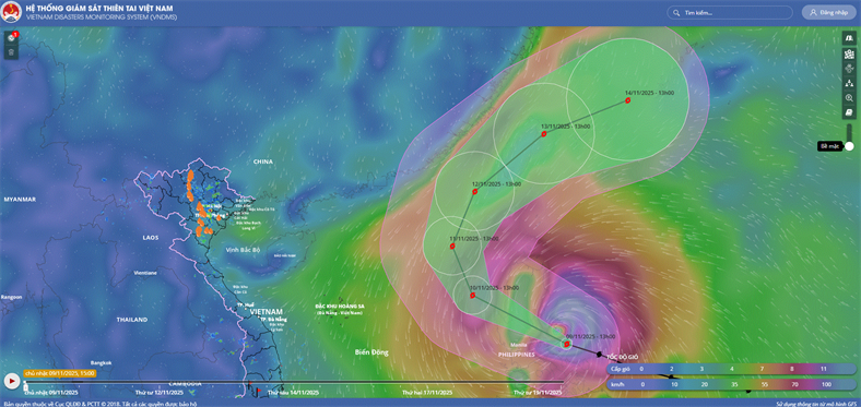 Hồi 19 giờ ngày 05/11, vị trí tâm bão ở vào khoảng 12,3 độ Vĩ Bắc; 116,3 độ Kinh Đông, cách đảo Song Tử Tây khoảng 240km về phía Đông Đông Bắc, cách Quy Nhơn (Gia Lai) khoảng 800km về phía Đông Đông Nam. Sức gió mạnh nhất vùng gần tâm bão mạnh cấp 14 (150-166 km/giờ), giật cấp 17. Di chuyển theo hướng Tây Tây Bắc, tốc độ khoảng 25km/h.