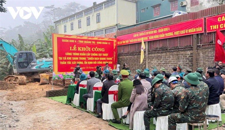 Chiều 15/12, tại xã Khe Sanh, tỉnh Quảng Trị diễn ra lễ khởi công công trình khẩn cấp chống sạt trượt trong “Chiến dịch Quang Trung” xây dựng lại nhà cửa giúp dân vùng bị thiên tai.