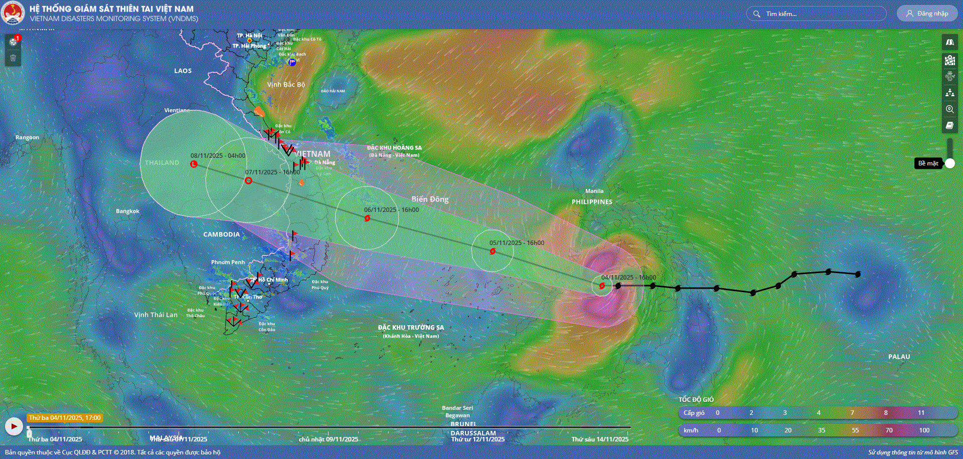 - Hồi 16 giờ ngày 04/11, vị trí tâm bão ở vào khoảng 10,7 độ Vĩ Bắc; 121,3 độ Kinh Đông, trên vùng biển phía Tây khu vực miền Trung Phi-líp-pin, cách đảo Song Tử Tây khoảng 770km về phía Đông. Sức gió mạnh nhất vùng gần tâm bão mạnh cấp 13 (134-149 km/giờ), giật cấp 16. Di chuyển theo hướng Tây với tốc độ khoảng 25km/h.