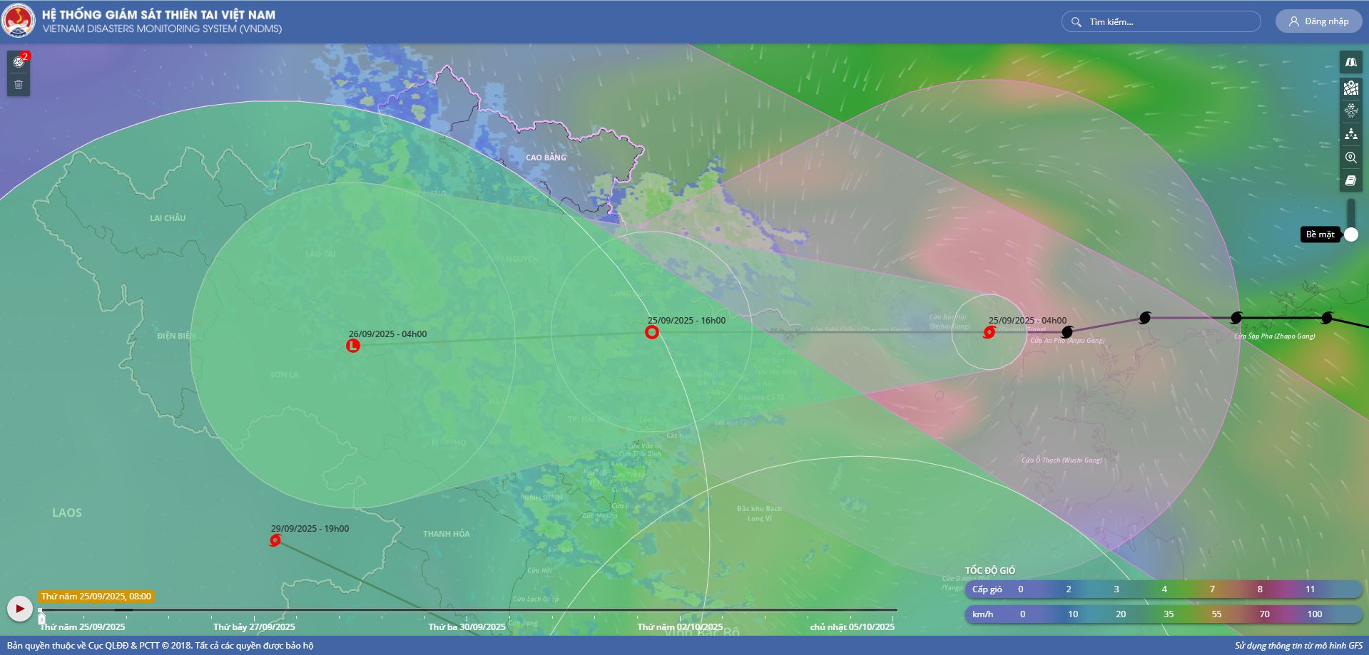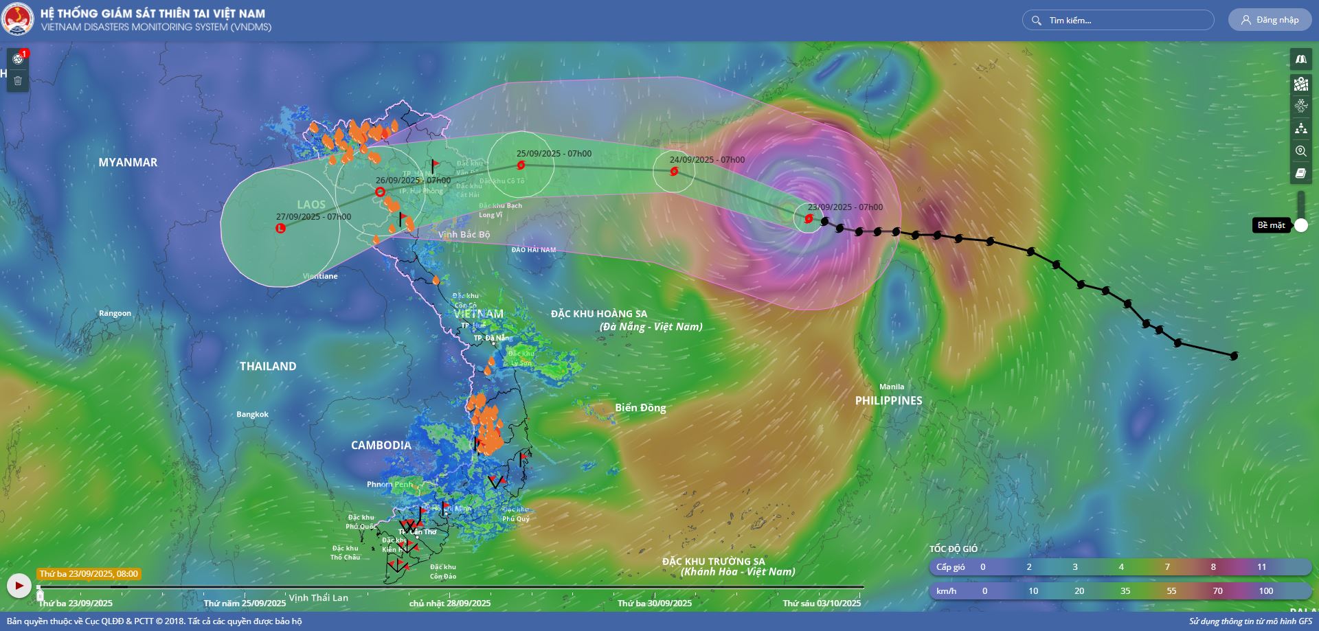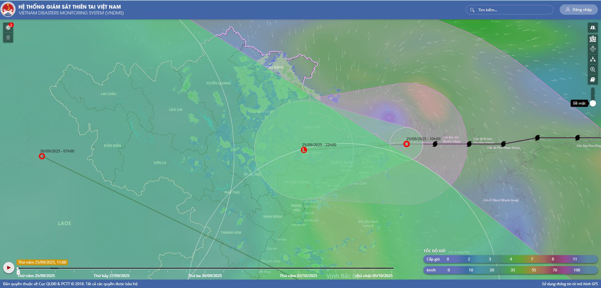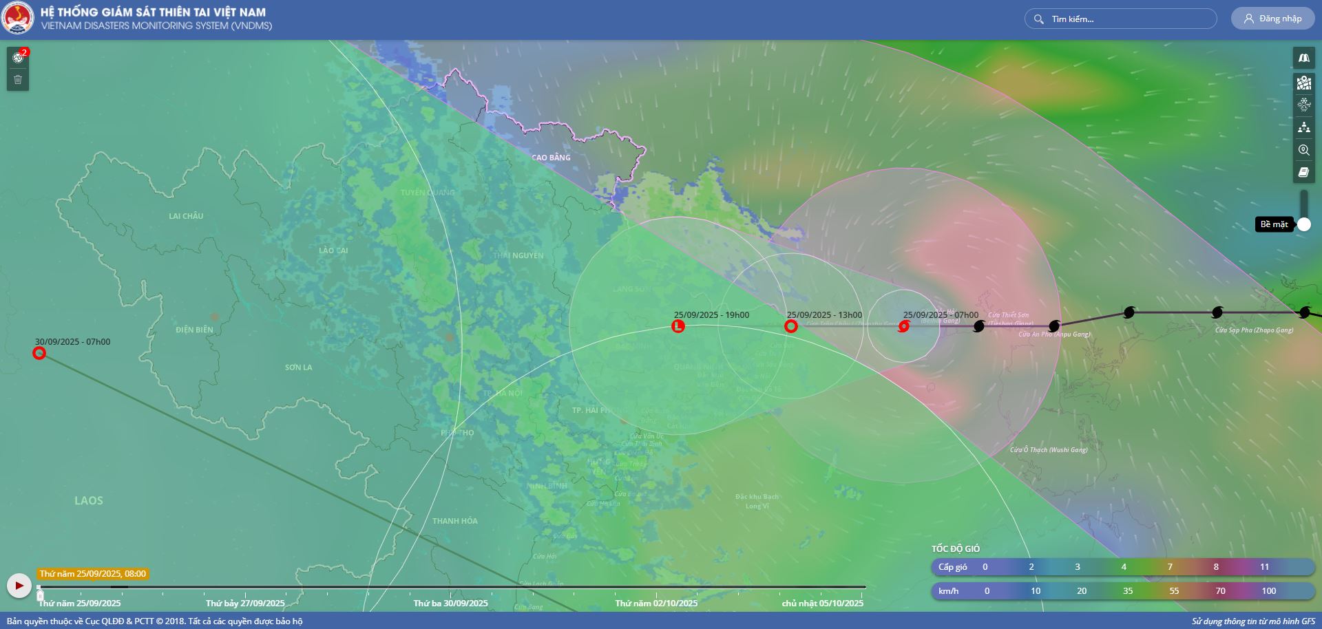- Hồi 07 giờ ngày 25/9, vị trí tâm bão ở vào khoảng 21,5 độ Vĩ Bắc; 108,9 độ Kinh Đông, cách Móng Cái (Quảng Ninh) khoảng 100km về phía Đông. Sức gió mạnh nhất vùng gần tâm bão mạnh cấp 8 (62-74km/giờ), giật cấp 10. Di chuyển theo hướng Tây, tốc độ khoảng 20km/h.