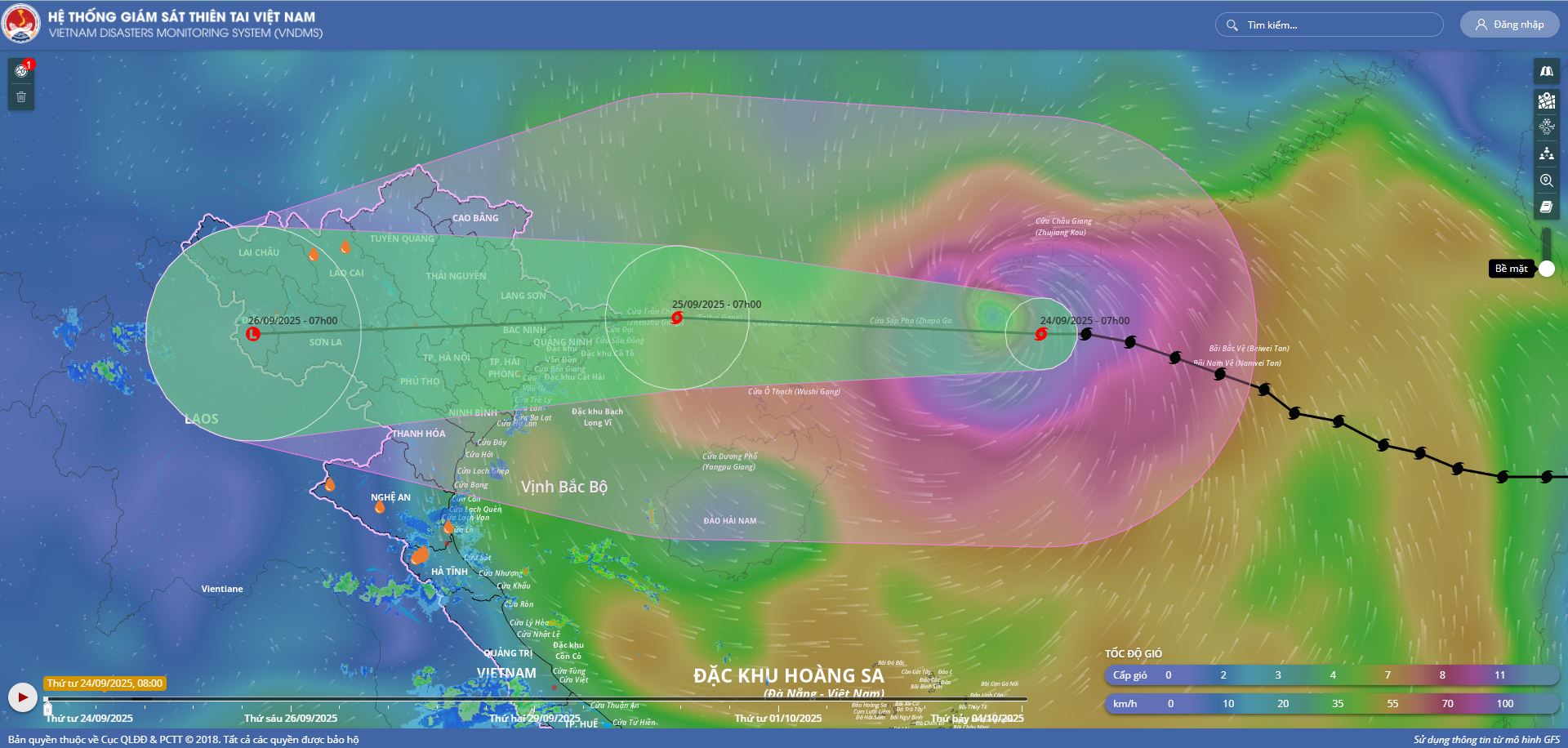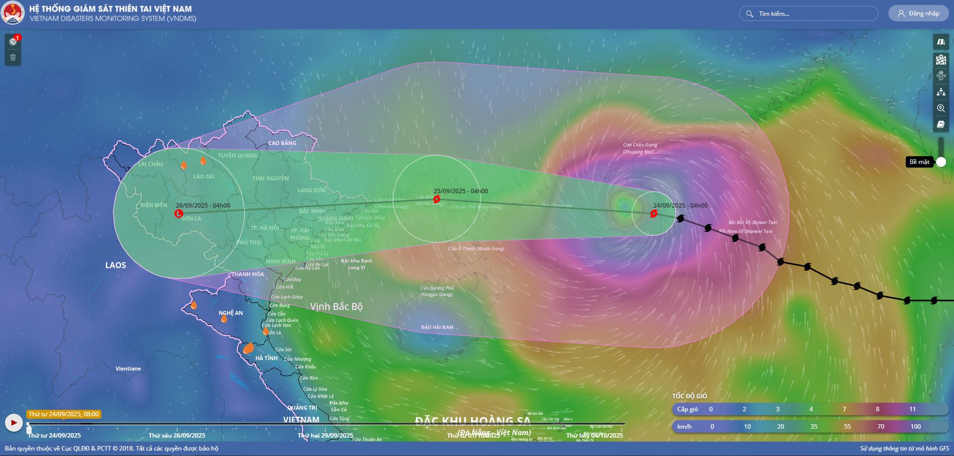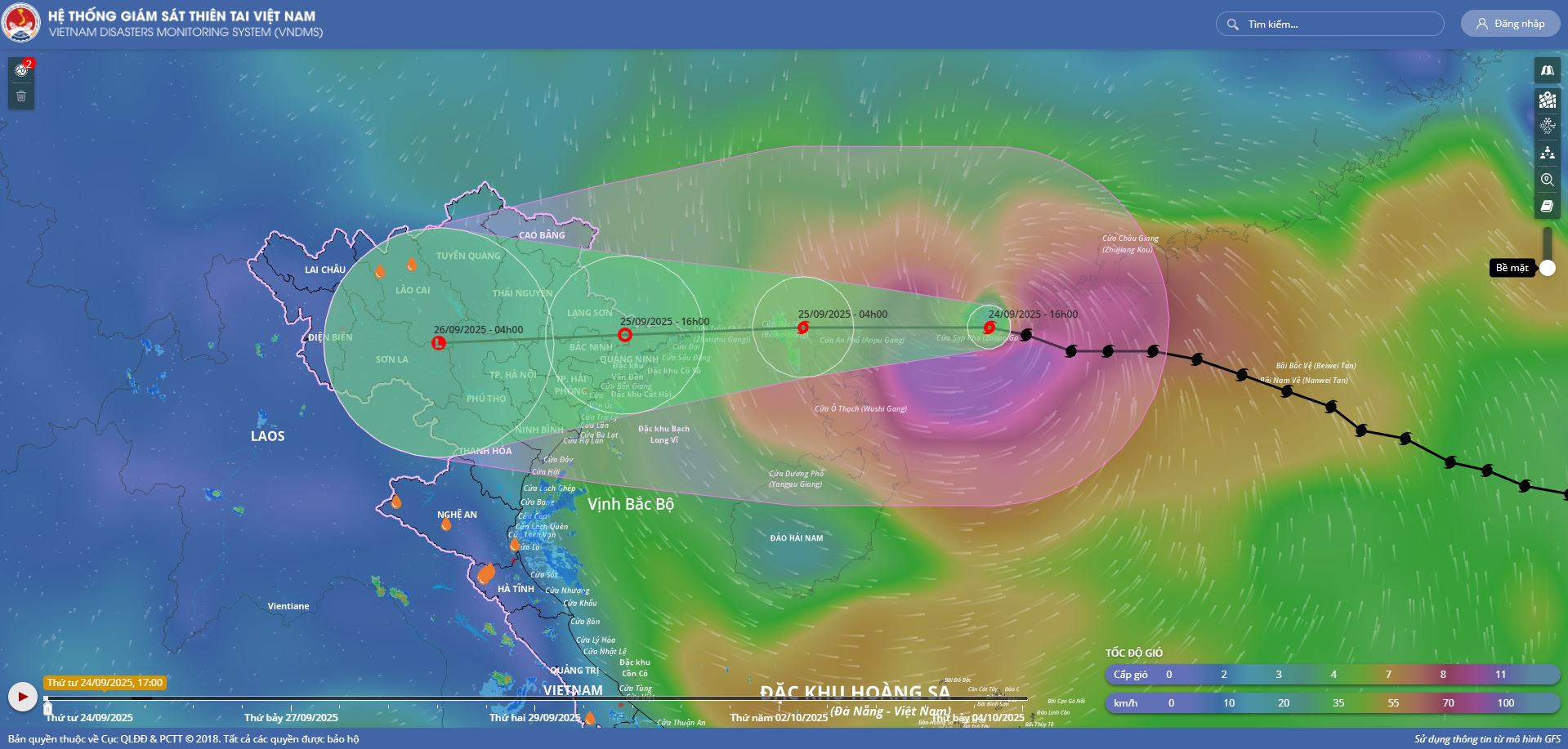 - Hồi 07 giờ ngày 25/9, vị trí tâm bão ở vào khoảng 21,5 độ Vĩ Bắc; 108,9 độ Kinh Đông, cách Móng Cái (Quảng Ninh) khoảng 100km về phía Đông. Sức gió mạnh nhất vùng gần tâm bão mạnh cấp 8 (62-74km/giờ), giật cấp 10. Di chuyển theo hướng Tây, tốc độ khoảng 20km/h.