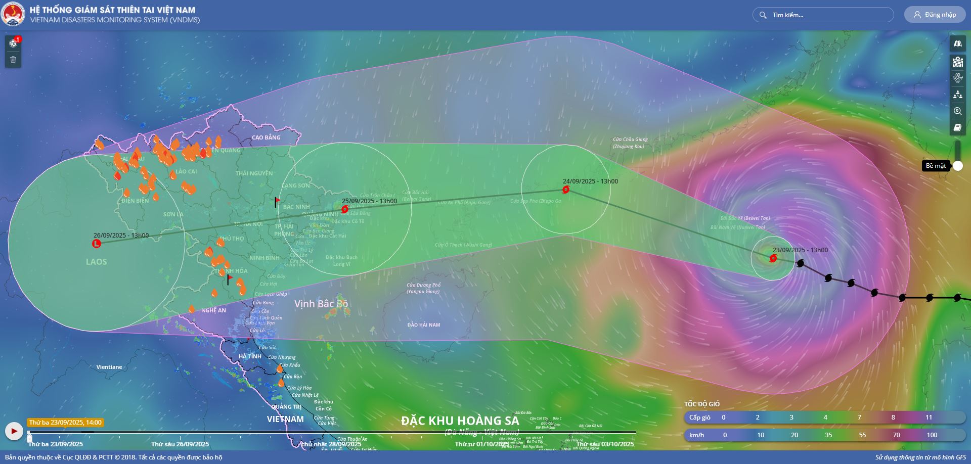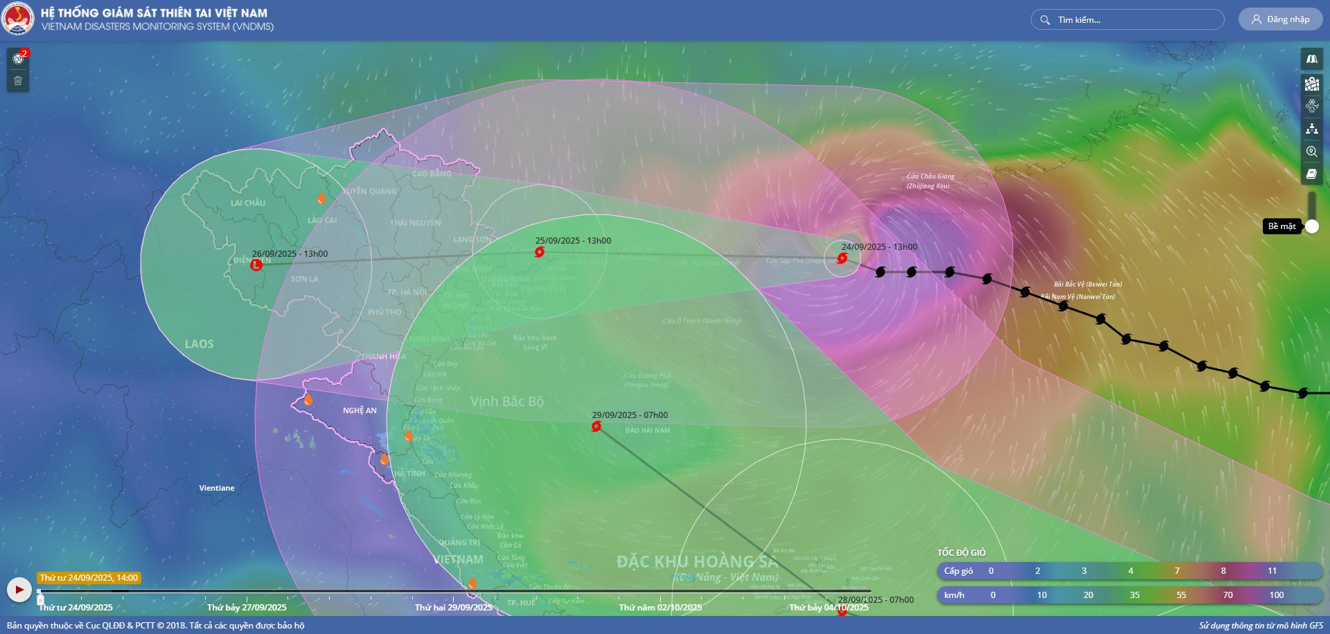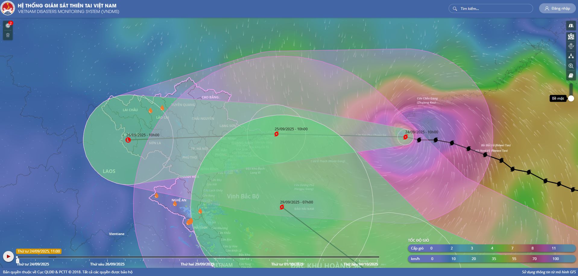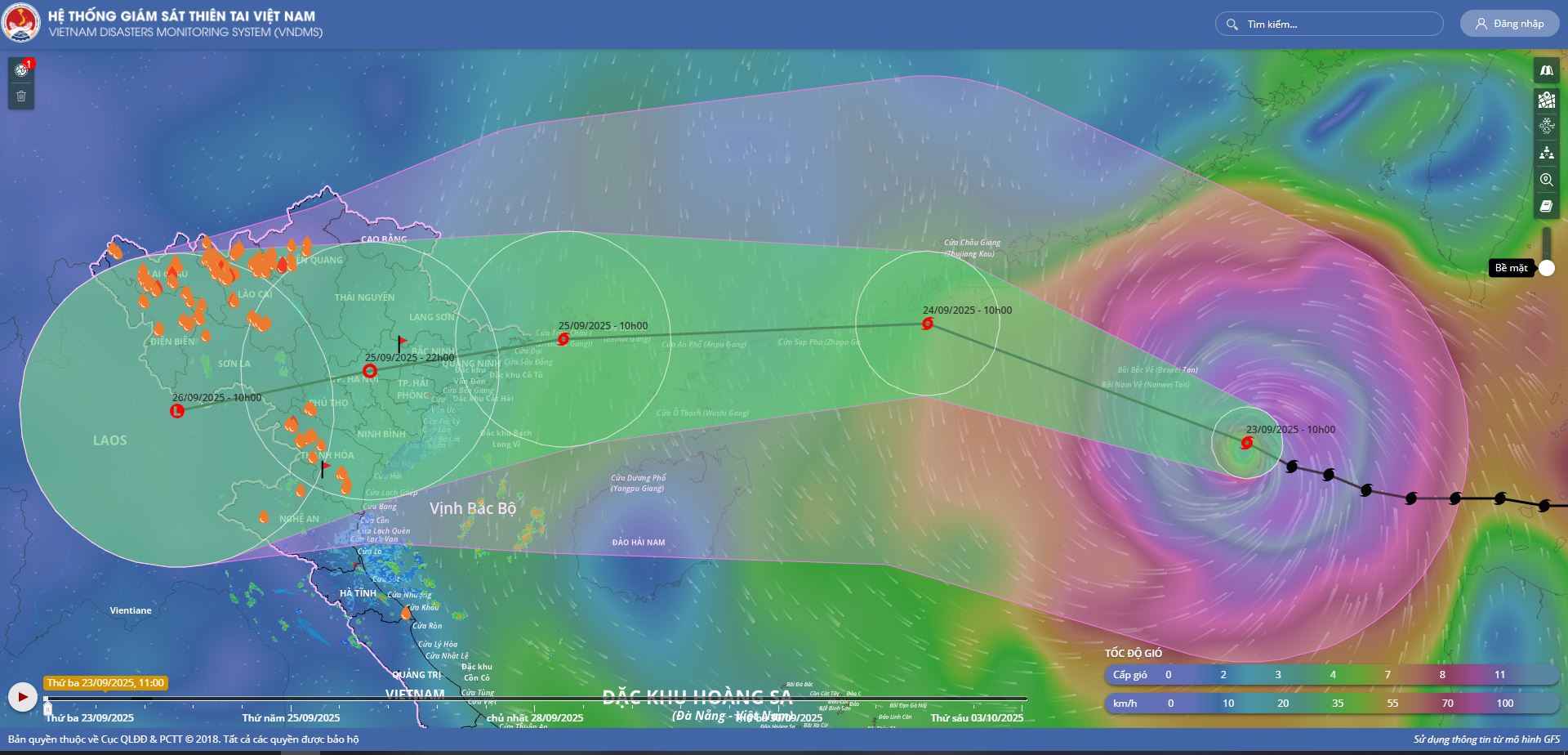 - Hồi 07 giờ ngày 25/9, vị trí tâm bão ở vào khoảng 21,5 độ Vĩ Bắc; 108,9 độ Kinh Đông, cách Móng Cái (Quảng Ninh) khoảng 100km về phía Đông. Sức gió mạnh nhất vùng gần tâm bão mạnh cấp 8 (62-74km/giờ), giật cấp 10. Di chuyển theo hướng Tây, tốc độ khoảng 20km/h.
