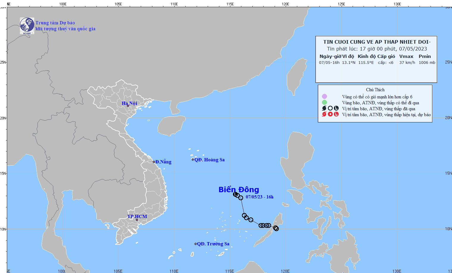- On the afternoon of May 7, the tropical depression weakened into a low pressure area in the middle of the East Sea.