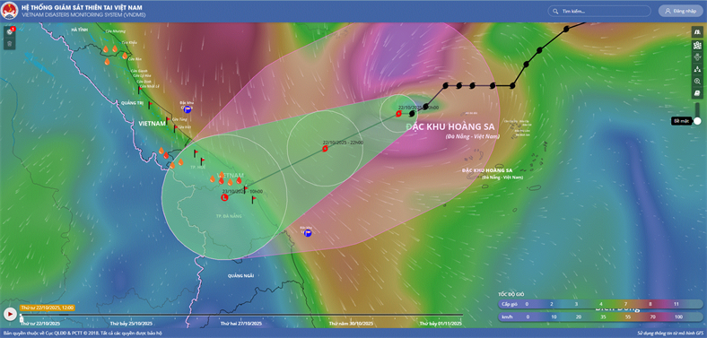 Hồi 07 giờ ngày 22/10, vị trí tâm bão ở vào khoảng 17,1 độ Vĩ Bắc; 110,7 độ Kinh Đông, trên vùng biển phía Tây Bắc đặc khu Hoàng Sa, cách Tp.Đà Nẵng khoảng 280km về phía Đông Đông Bắc. Sức gió mạnh nhất vùng gần tâm bão mạnh cấp 10 (89-102km/giờ), giật cấp 12. Di chuyển theo hướng Tây Tây Nam, tốc độ khoảng 10km/h.