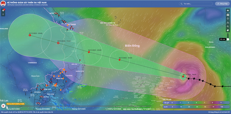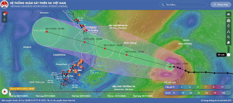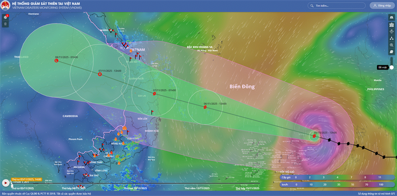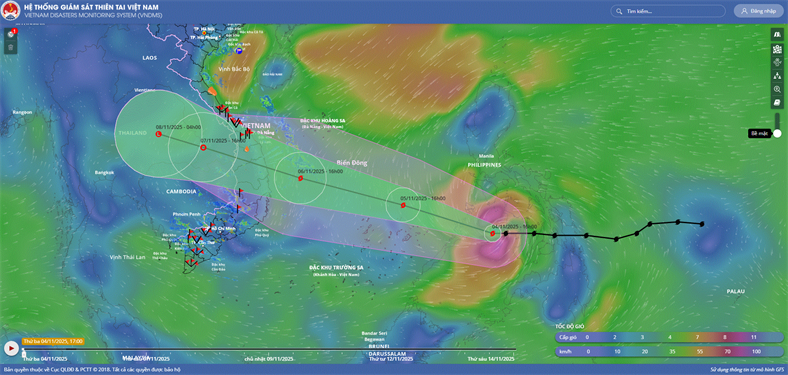 Hồi 16 giờ ngày 05/11, vị trí tâm bão ở vào khoảng 12,1 độ Vĩ Bắc; 117,0 độ Kinh Đông, cách đảo Song Tử Tây khoảng 300km về phía Đông Đông Bắc, cách Quy Nhơn (Gia Lai) khoảng 880km về phía Đông Đông Nam. Sức gió mạnh nhất...