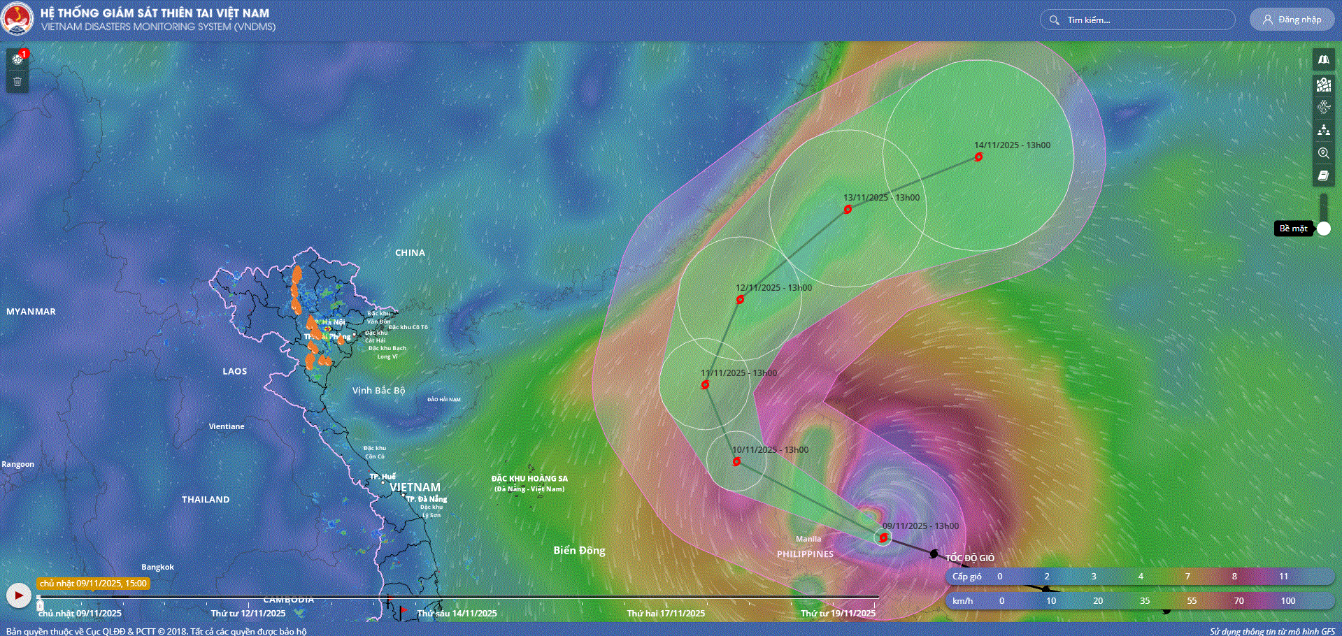 - Hồi 13 giờ ngày 09/11, vị trí tâm bão ở vào khoảng 14,8 độ Vĩ Bắc; 123,3 độ Kinh Đông, trên vùng biển phía Đông đảo Lu-dông (Philippin). Sức gió mạnh nhất vùng gần tâm bão mạnh cấp 15-16 (167-201km/giờ), giật trên cấp 17. Di chuyển theo hướng Tây Tây Bắc, tốc độ khoảng 25km/h.