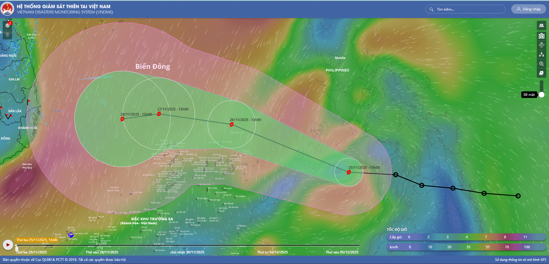 - Hồi 16 giờ ngày 26/11, vị trí tâm bão ở vào khoảng 12,5 độ Vĩ Bắc; 116,1 độ Kinh Đông, cách đảo Song Tử Tây khoảng 230km về phía Đông Bắc. Sức gió mạnh nhất vùng gần tâm bão mạnh cấp 10 (89-102km/h), giật cấp 13. Di chuyển theo hướng Tây Tây Bắc với tốc độ khoảng 20km/h.
