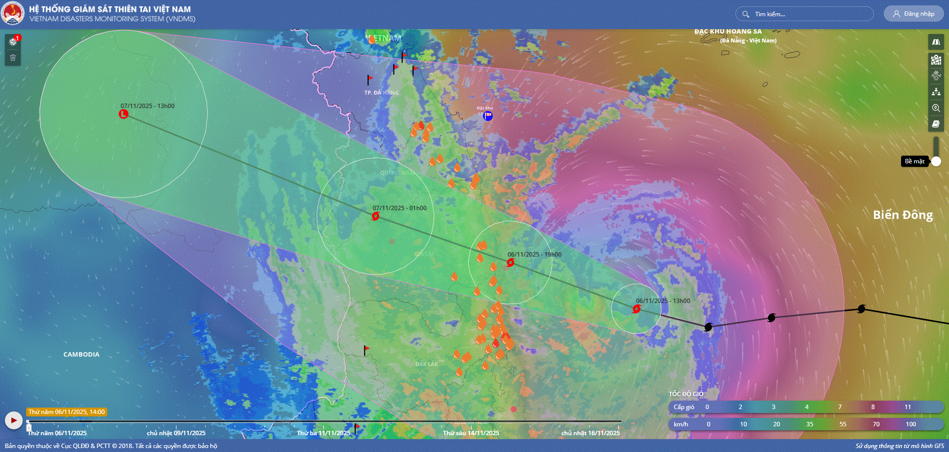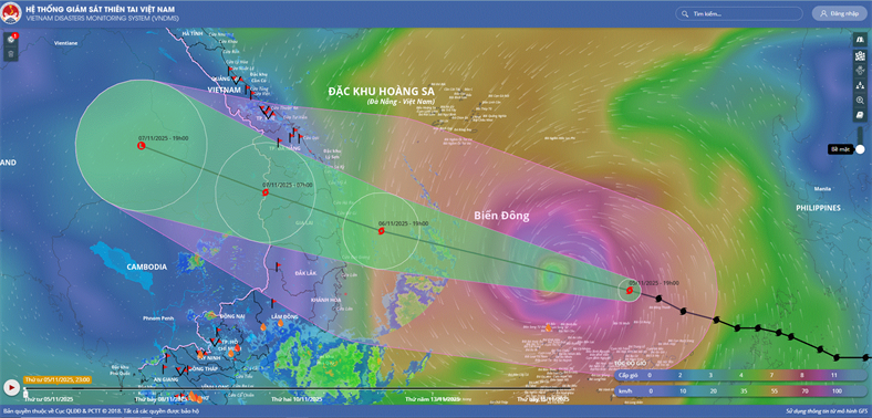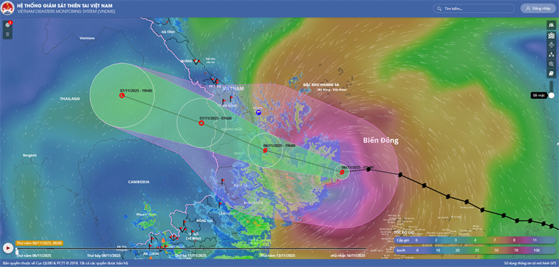 Hồi 13 giờ ngày 06/11, vị trí tâm bão ở vào khoảng 13,3 độ Vĩ Bắc; 110,8 độ Kinh Đông, cách Quy Nhơn (Gia Lai) khoảng 190km về phía Đông Đông Nam. Sức gió mạnh nhất vùng gần tâm bão mạnh cấp 14-15 (150-183 km/giờ), giật...